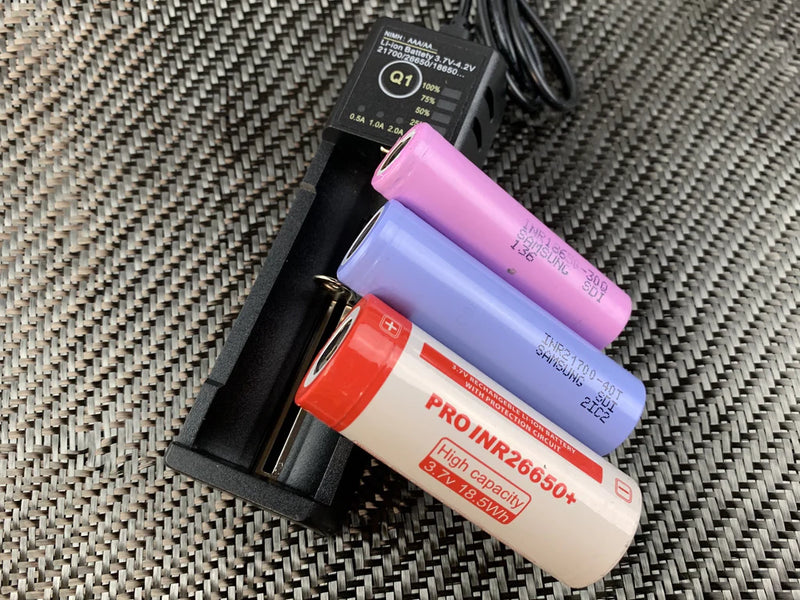 This amazing charger works with cells from 10440 / RCR123 all the way upto 18650 / 26500 / 26700 cells and everything in-between.